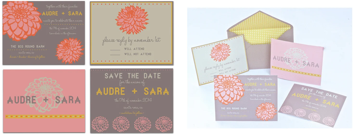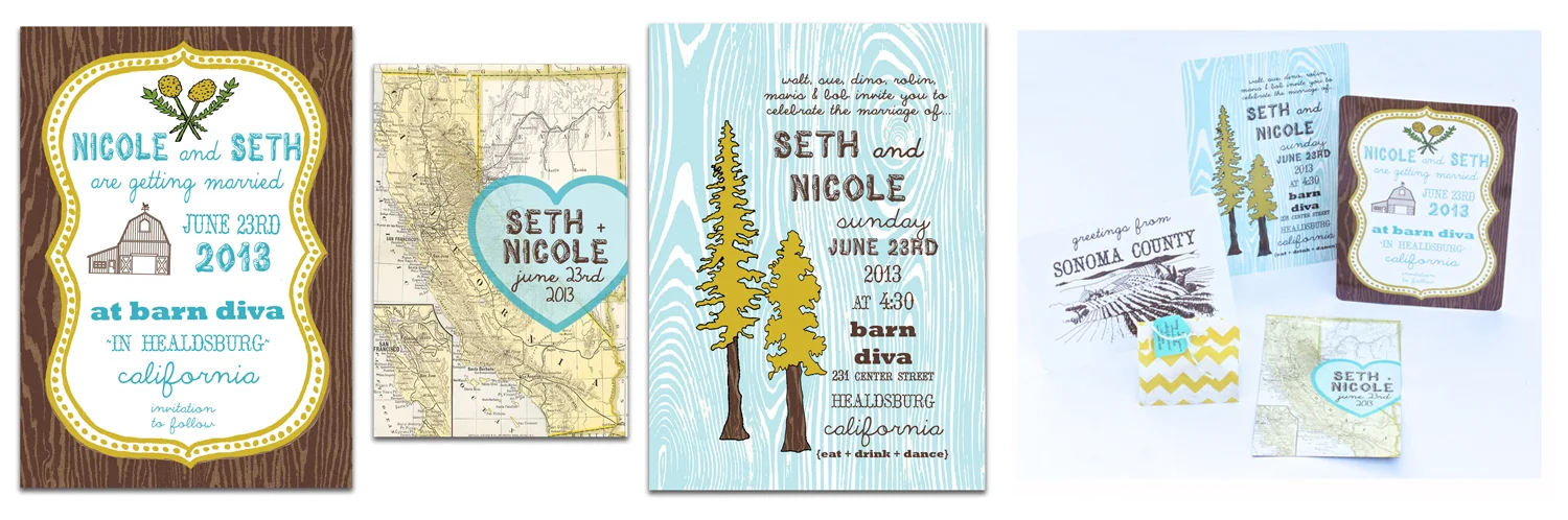 For my own wedding, the setting, Sonoma County’s wine country was the largest dictator of our aesthetic. I combined natural elements like tall trees and wood patterns with a vintage California map and our light teal and mustard yellow color palette to create invitations that reflected a sense of place as well as our personalities.