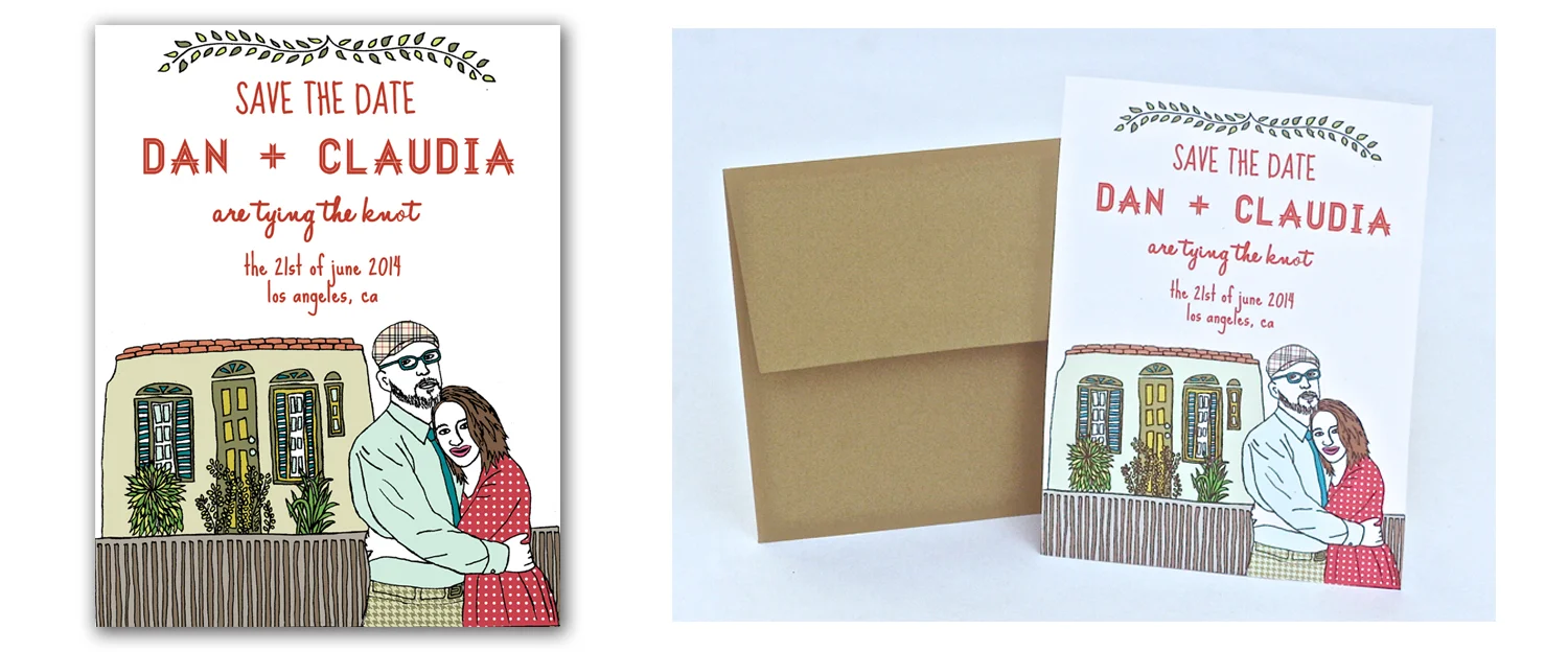 For Claudia and Dan's save the date cards I incorporated some of their favorite elements like pattern and plants in this custom illustration of them in front of their house.