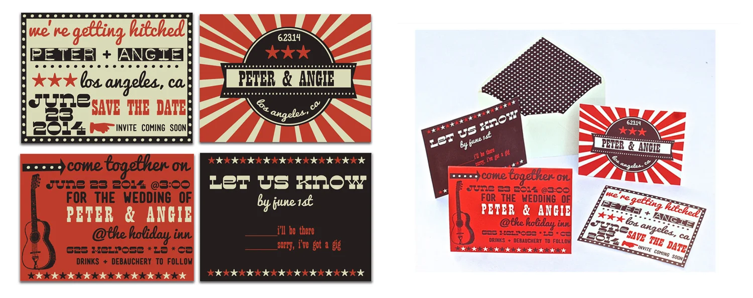 For two musicians who were tying the knot in Los Angeles I created something with a vintage Southern feel and a bold color palette that reflects their love of classic country music and the aesthetic of the 1960s rock and roll.
