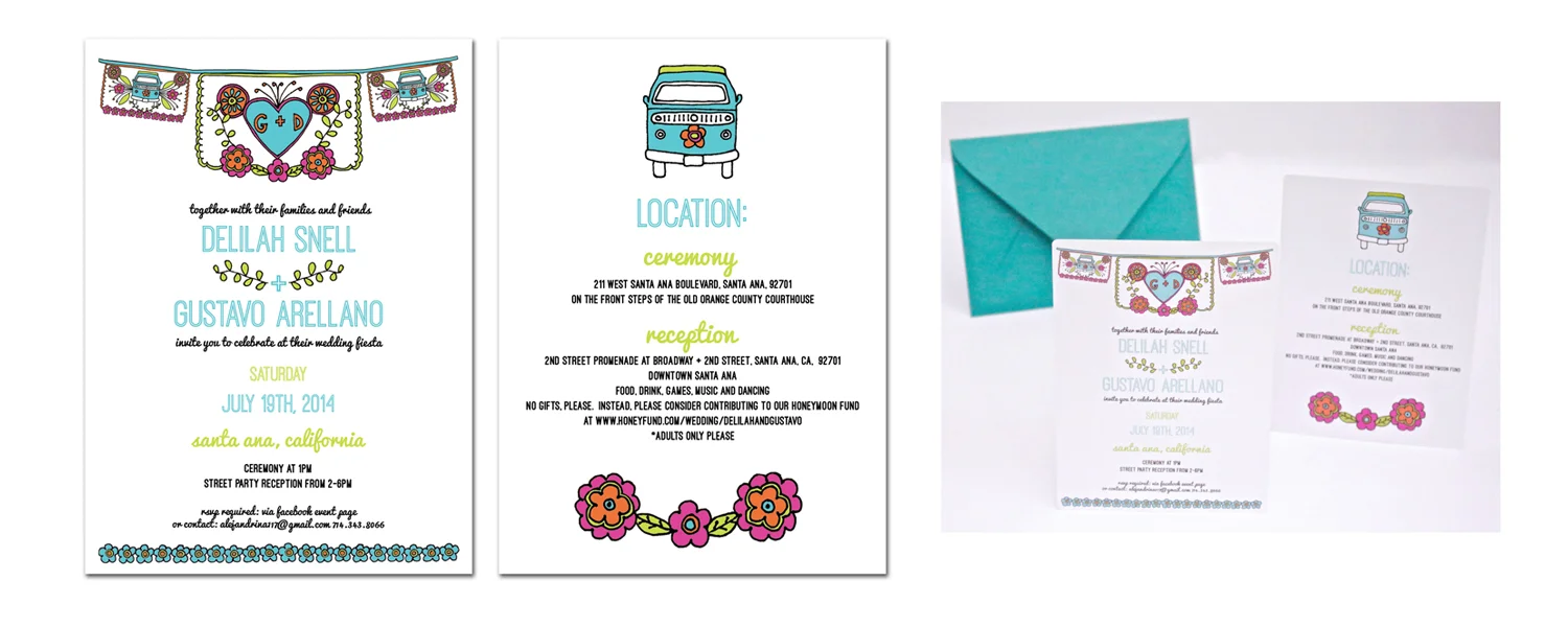 Delilah and Gustavo wanted their invitation to reflect their Mexican heritage as well as the Latino culture of the city where they got married. I choose a bright color palette and did an interpretation of traditional papel picados incorporating their vintage VW bus which served as a Michelada bar at their outdoor street festival wedding.