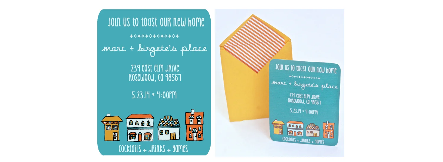 For this housewarming announcement I drew interpretations of houses on the the street where they were moving and paired it a bold yet bright color palette
