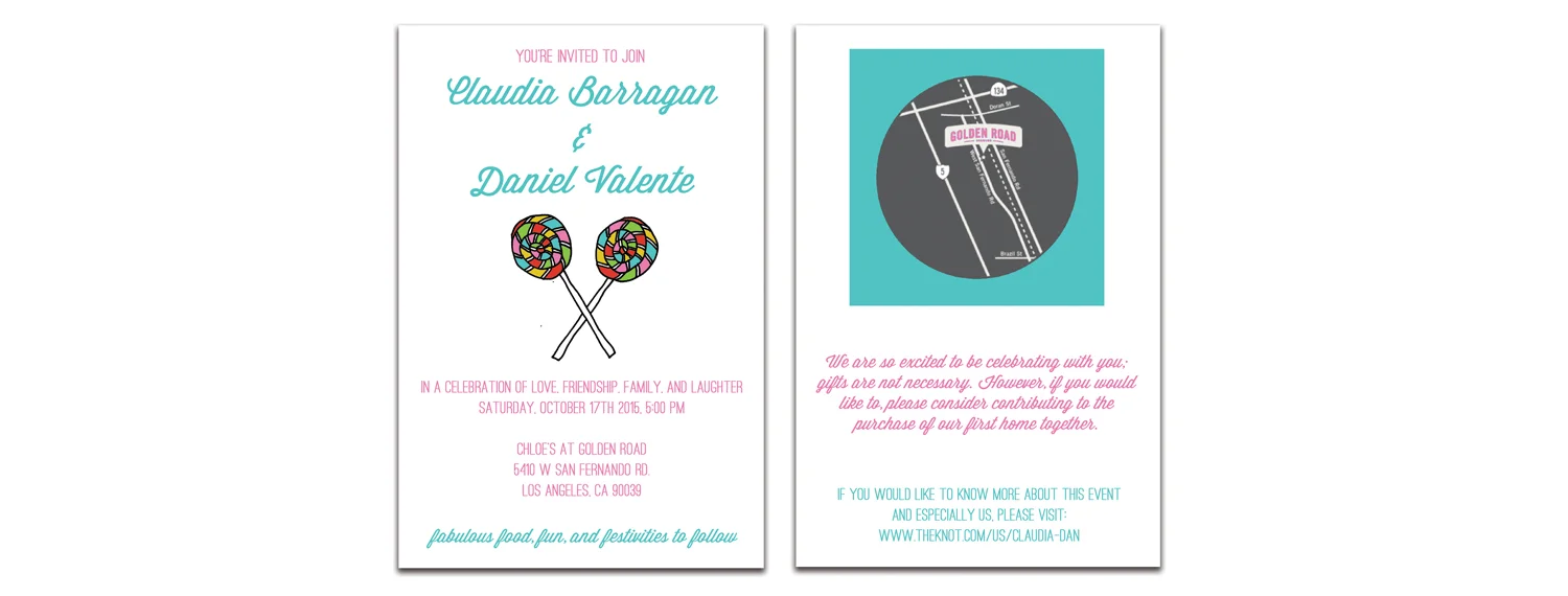 Claudia and Dan wanted very simple invitations with a lot of negative space and a single graphic. Since the theme of their wedding was candy shop the two crossed lollipops not only reflect that motif but also symbolize their union.